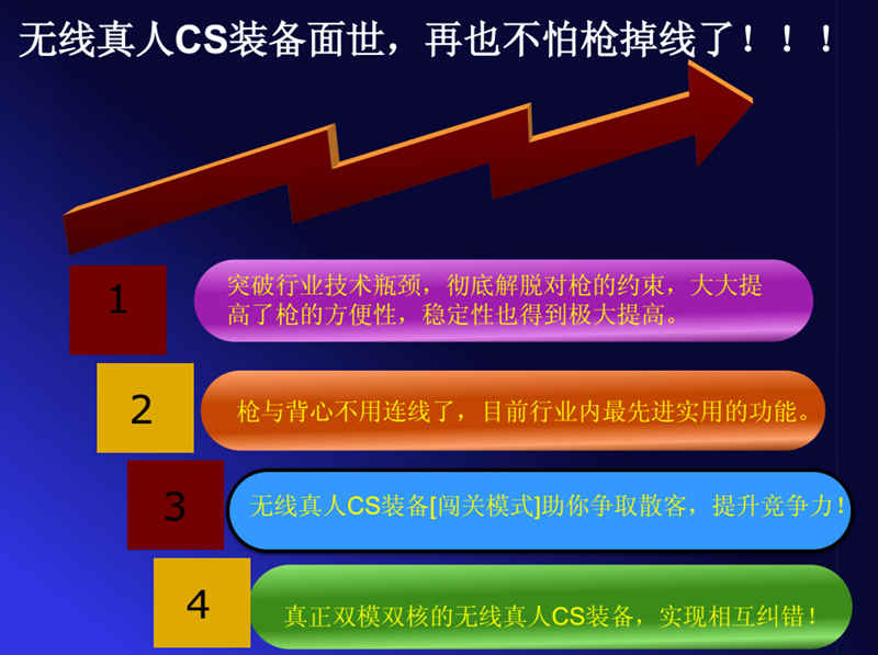 真人CS裝備從彩彈發(fā)展到激光花了3年的時間,現(xiàn)已被愛好者廣泛接受,激光真人CS裝備在安全、娛樂、計分、功能、戰(zhàn)術等方面的優(yōu)勢,遠遠超越了彩彈設備。無線真人CS裝備代替有線真人CS裝備,是真人CS裝備的第二場革命。就像手機必然代替座機一樣,一開始不被接受,到現(xiàn)在是機不離手……